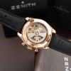 – Núm chỉnh giờ: Làm bằng vàng hồng nguyên khối và khắc nổi logo Zenith